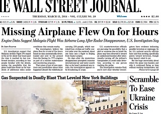 The Wall Street Journal says Investigators in the U.S. now believe the missing Malaysia Airlines flight flew on for hours after disappearing from radar. That means the plane could have flown for hundreds of miles from where its last position was recorded. U.S. counterterrorism officials are pursuing the possibility that someone may have diverted the plane after turning off the transponders.