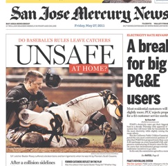 There’s a photo that’s hard to look at on the front page of the San Jose Mercury News this morning. It’s of Giants’ catcher Buster Posey getting clobbered by a Florida Marlins player sliding into home. Though it looks like his neck is about to snap in half, Posey hobbled away with a broken leg and several torn ankle ligaments. The Mercury News says his injury has prompted a discussion within the MLB about whether rules should be changed to protect catchers. Said the Giants’ manager: “There are so many who have gotten hurt—and not just a little bit. I mean, careers ended or shortened.”