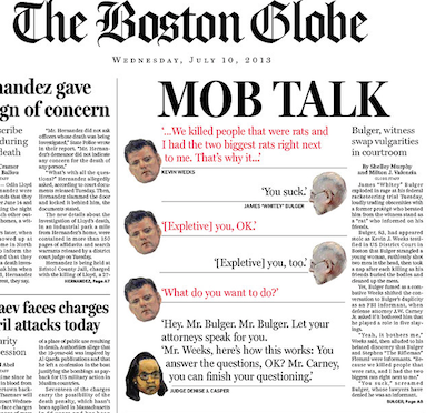 The Boston Globe puts a rat-a-tat exchange from the Whitey Bulger trial on its front page this morning. Bulger, who is on trial for racketeering, had a heated back-and-forth with a star witness for the prosecution, which ended in a string of expletives that sounded straight out of a mob movie. It started with Bulger’s response to Kevin Weeks, a former protege of the gangster, who told the courtroom about a deal he made to testify: