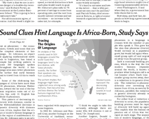There’s an interesting story in today’s New York Times about the evolution of language. Apparently, a researcher has detected a common element in all language that suggests Africa is the place where humans first spoke. The more controversial outcome of the findings is the idea that “modern language originated only once,” which is apparently a hotly-debated topic among linguists. The new theory looked at phonemes, which are the sounds that make up language, instead of words. The idea is that the farther a group moved away from Africa, the fewer phonemes are found in their languages: “Some of the click-using languages of Africa have more than 100 phonemes, whereas Hawaiian, toward the far end of the human migration route out of Africa, has only 13. English has about 45 phonemes.”