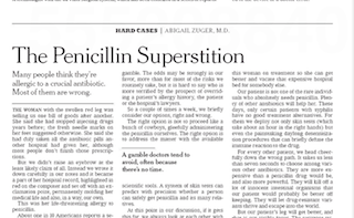 According to the New York Times, one in ten Americans self-report a penicillin allergy. Nine out of ten of them are wrong. Part of the problem is that people misuse the word allergy. While some drugs can have less than desirable side effects, they are not technically allergic reactions. And many people who really do have a legitimate allergy to penicillin outgrow it by the time they are adults.