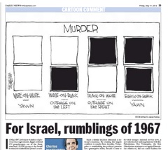 It’s murder, simplified. The New York Daily News reprints a Philadelphia Daily News editorial cartoon showing how the public reacts to various murders. “White on White=Yawn.” “White on Black=Outrage on the Left.” “Black on White=Outrage on the Right.” “Black on Black=Yawn.”