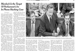 A second article about Murdoch’s troubles, this one on the Times’ business front page, starts out with this scathing sentence: “Risk-taking and line-skirting have always been just one more cost of doing business for Rupert Murdoch.”
