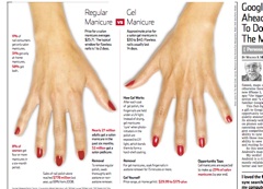 I’ve got to admit, these hands look identical to me. But apparently, there’s a big difference between a regular old manicure and these new gel-based ones. The Wall Street Journal says gel manicures cost twice as much as the traditional treatment and can last up to two weeks with no chips. The downside? A recent study found that the nails of women who applied gel polish for a year had “weakness, brittleness and thinning” though it’s unclear if that’s from chemicals in the polish or the arduous removal process.