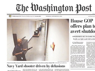Still images from surveillance video of the D.C. Navy Yard shooter are on the front page of dozens of papers this morning, including the Washington Post. The FBI said yesterday Aaron Alexis was being driven by delusions that he was controlled by low-frequency radio waves. He also scratched the words “End the torment!” on the barrel of the shotgun he used to kill 12 people last week.