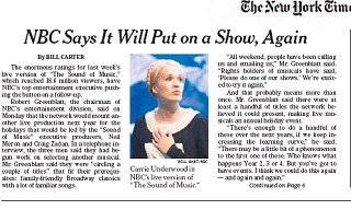 After drawing 18 million viewers for its live production of the Sound of Music, NBC executives say they’re already working on selecting another musical to produce live next year. The New York Times says NBC is once again looking for something family-friendly with a lot of familiar songs. NBC says there are a few titles that it could produce, meaning we could see the live musical become a holiday tradition for the network.