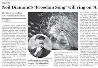 Neil Diamond has penned a new song, just in time for the 4th of July, reports the USA Today this morning. Called “Freedom Song,” Diamond says he was inspired by the tragedy at this year’s Boston Marathon: “This song has been bubbling inside of me for a long time…“I didn’t know what it would be when I first started it, but I knew it was a love song; a love song between a man, his country and his fellow citizens.” He’ll debut the song during the Washington Nationals-Milwaukee Brewers baseball game tomorrow night.