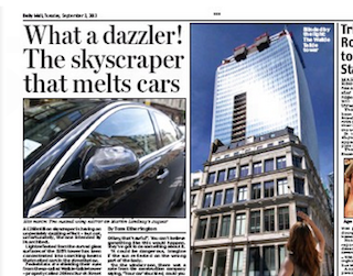 The reflection off a new skyscraper in London is so bright that it’s being blamed for melting everything in its path—including a few cars. The Walkie Talkie building is only partially completed but complaints are mounting. People say its ability to reflect light is so intense that it’s causing paint to peel, fabric to scorch and tiles to pop off in neighboring buildings. And on the street, parking around the project has been suspended after a Jaguar and several bicycles melted.