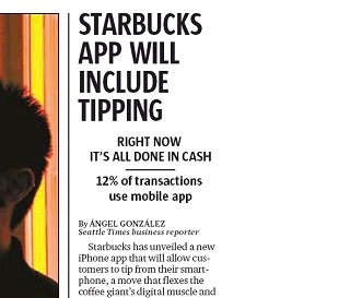 Starbucks is out with a new mobile app that allows you to tip from your smartphone. The company says right now 10 million customers use the app, accounting for 12 percent of all transactions. The Seattle Times says Starbucks has also added a “shake to pay” feature so that when a customer shakes their phone, a barcode pops up which the barista scans to complete the transaction.