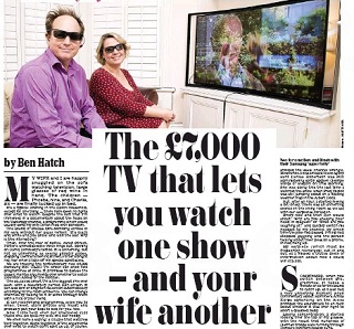 Novelist Ben Hatch reviews Samsung’s new TV for the Daily Mail. It allows you to watch one show while someone else is watching another. You both wear special glasses and headphones and Hatch says the technology worked perfectly. He was able to watch what he wanted, while his wife watched her shows. But both admit that after a while, they got a little lonely, so they went back to their $160 television.