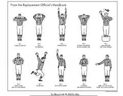 Whew. After massive media pressure, the NFL managed to strike a labor deal with its referees late last night.  The New York Times has a funny spin on the news this morning,  printing a cartoon of on-field signals for replacement refs. Like figure 6 in the lower left, which is the official sign for “what game are you watching?” Or next to that, figure seven, which is the signal for a home run.