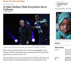 Nike unveiled new NFL uniforms yesterday in Brooklyn, says the New York Times. Every team fared pretty well with the re-design—except the Seattle Seahawks. It’s not quite the University of Oregon’s Seaducks uniform fiasco but it’s close. Nike designers say they added feather patterns to the Seahawks’ jerseys to represent the Pacific Northwest’s Native American heritage.