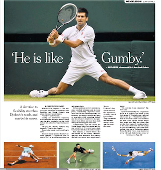 Novak Djokovic says yes, he knows who Gumby is. And despite their shared characteristic of elasticity, he doesn’t like the comparison. He might not like it, says the New York Times, but it’s a description that’s lobbed at him by everyone who watches him play. The 26-year-old Serb has become known for his “quickness; power; tactical acumen; excellent technique and, in recent years, considerably improved endurance,” as much as for his twists, turns and splits.
