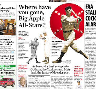 Next Tuesday will mark the 10th time New York City has hosted MLB’s All-Star Game. So where are all its star players, asks USA Today? There are a few players in the starting line-up, like the Mets David Wright and the Yankees Robinson Cano but that’s nothing compared to the star power the city brought in say, 1934 when both Babe Ruth and Lou Gehrig were on the field or in 1949 when it was Joe DiMaggio and Jackie Robinson.