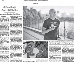 The New York Times profiles Jack Hirschowitz in the sport section this morning. Hirschowitz is planning to “joggle” the NYC Marathon—jog while juggling. He tells the Times he thought he was a pioneer when he first combined jogging and juggling in the 90s, only to find out that the sport had a name and an active community. Yes, folks, there is a World Joggling Competition.