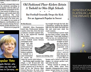 High school football place kickers in Ohio are still doing things the old fashioned way. The Wall Street Journal says many young kickers in Ohio still subscribe to the old toe-style kicking for kickoffs and field goal attempts. Soccer-style kicking with the instep of the foot has been the norm in the sport for decades. One manufacturer of special shoes for toe-kicking says 98% of the shoes he makes get shipped to Ohio. VIDEO