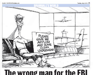 Editorial cartoonist Bill Bramhall has a funny take on another predicament Edward Snowden is likely facing in this morning’s New York Daily News. He draws Snowden in the Moscow airport holding a sign that reads, “Please give me asylum….and some clean underwear.”