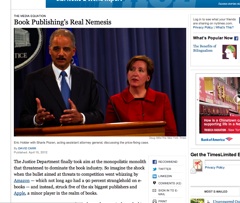 The Justice Department’s decision to sue Apple and five publishing companies for e-book price fixing while ignoring Amazon’s influence caught New York Times’ columnist David Carr’s eye this morning. He says that’s like ” taking on Standard Oil but breaking up Ed’s Gas ’N’ Groceries on Route 19 instead.”  Carr says the Apple lawsuit misses the point that Amazon is “publishing’s real nemesis.”