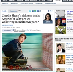 Andrea Tantaros of the New York Daily News has a sensible column on Charlie Sheen in this morning’s paper. She says we’re all part of the problem because we have this thirst for what she calls “meltdown porn.” Tantaros writes: “In the wake of meltdowns by Lindsay, Britney and Mel, it’s safe to say that the cult of self-destructive celebrity is our favorite drug.” The problem, as Tantaros sees it, is that Sheen is is a bad boy, but like the character he plays on “Two and Half Men,” he’s a fun bad boy…“and there’s nothing Americans love more than that.”