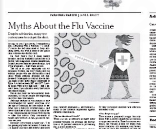 Jane Brody’s health column in the New York Times this morning dismisses any excuses you might have for avoiding a flu shot. She says even if you don’t fall into one of the high risk categories—pregnant, elderly, chronically ill—think about your kids: “Almost anywhere they go, children could come in contact with a cancer patient on chemotherapy, a pregnant woman, or someone with asthma, diabetes, heart disease or a kidney or liver disorder.”