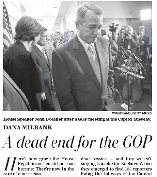 In the Washington Post, Dana Milbank says the fact that House GOP leaders had a mortician lead them in the singing of Amazing Grace before Tuesday’s meeting was fitting, since they are “burying the republican brand and America’s standing in the world.” Milbank says if the Republicans get blamed for the shutdown and a default, the only way they’ll preserve their majority is with embalming fluid.