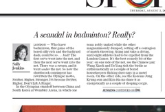 Eight badminton players from China, South Korea and Indonesia have been booted from the Olympic for trying to lose, which would guarantee them a good position in the next round.  Washington Post columnist Sally Jenkins can’t get over that the “game of the bored-silly rich and the backyard dads, could be so . . . bad?” She goes on to say that, regardless of the sport, watching elite athletes take dives is disheartening at best, and at worst, defrauds spectators.