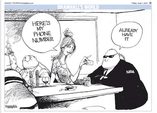 The New York Daily News responds with a cartoon: A waitress offers her phone number to an NSA official. His response? “Already have it.”
