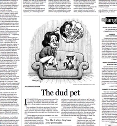 Boston Globe columnist Joan Wickersham addresses a “delicate problem” in today’s paper: the case of the dud pet. In Wickersham’s very funny column, the dud in question is a cat: “The dud pet is the one you just can’t bond with. Your relationship is like a plane that taxis and taxis and never quite lifts off the runway. You try. You feed her and stroke her and talk to her. You do your duty, but you never feel the love.” Wickersham writes that though she knows she’s bound to care for her dud, sometimes, she has fantasies: “Sometimes ladies strolling along the sidewalk stop to talk to her. You can hear them through the open window, telling her how pretty she is and saying that they wish they could take her home. You wish they would.” Click through to read the rest—it’s worth it.