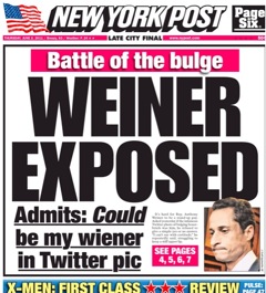 “Weiner Exposed.” The New York Post didn’t even have to reach into its arsenal of puns for this story. Rep. Anthony Weiner went on a media tour yesterday, one the Post calls the “biggest damage-control disaster since Charlie Sheen’s postmeltdown media blitz,” as questions about the crotch shot sent from the congressman’s account to that of a 21-year-old female college co-ed continued. He admitted the photo could be a self-portrait but refused to elaborate. When asked by the Post if he’d ever taken sexually-explicit photos, Weiner said, “There are photographs of me in the world, yes.”