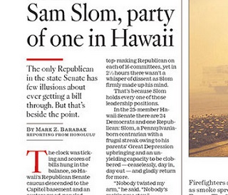 There’s being in the minority in politics, and then there’s Sam Slom. He’s the only Republican in Hawaii’s State Senate. The Los Angeles Times says Slom makes up the only single-member caucus anywhere in the country. He says he knows he’ll never get any legislation passed, but he fights on, with what the Times says is an “unyielding capacity to be clobbered.”