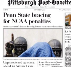 That’s Joe Paterno on the front page of the Pittsburgh Post-Gazette—the guy in the middle. A forklift carried away the 900-pound, 7-foot-tall statue of the former Penn State coach yesterday as a crowd of fans gathered to say goodbye. University officials are now bracing for a wave of fines to come down from the NCAA in the wake of Jerry Sandusky’s ongoing sex-abuse scandal.