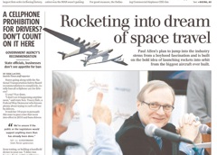 Billionaire Paul Allen wants to build the biggest plane in the world and launch rockets from it. The Seattle Times says the Microsoft co-founder unveiled his plan yesterday, saying it was up to the private sector to “keep America at the forefront of space exploration.”