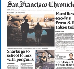Are you nuts? That’s what I imagine those penguins are going to say when they hear the news: a school of sharks is moving into their aquarium at the California Academy of Sciences. The San Francisco Chronicle says the “purpose is not to create mass carnage, but to show both species in a more natural context.” Tell that to the penguins.