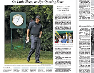Phil Mickelson started off the US Open on about four hours of sleep, reports the New York Times this morning. His daughter graduated from 8th grade on Wednesday, which means to hear her commencement speech he had to hop in his private jet in San Diego, catch an hour of sleep on the plane, another hour or two when he landed in Philadelphia and be ready to hit the course at 5:30 in the morning. All in all, Mickelson put in an impressive 18-hour day and managed to shoot a 67.