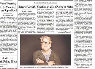 Bruce Weber writes the New York Times’ obituary for Oscar-winning actor Philip Seymour Hoffman, who died over the weekend of an apparent drug overdose. Weber says that to merely recount Hoffman’s credits “undervalues his versatility and his willingness, rare in a celebrity actor, to explore the depths of not just creepy or villainous characters, but pathetically unattractive ones.” Weber says that while Hoffman did not have the look of the traditional leading man, he was more than capable of playing one.