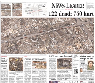 There is a shocking photo on the front page of the Springfield News-Leader. It’s an aerial shot of the destruction in Joplin, Missouri three days after a massive tornado wrecked havoc on the town. So far the death toll is estimated to be 122; 750 people reported injuries caused by the twister, which damaged 8000 structures. Meteorologists have classified the tornado as an E-5 storm and say it’s the deadliest one to strike in 60 years. The Joplin fire chief described the scene as “unreal,” saying, “I grew up in this town, and it’s hard to tell where I’m at.”