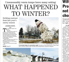 There’s a sad-looking snowman on the front page of the Fargo Forum this morning. Temperatures around the midwest have been unseasonably high this week. The photo on the bottom left shows roof-high snow in North Dakota on January 5, 2011. On the right, is the same stretch of driveways this year.