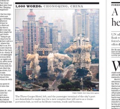 Sometimes a picture really is worth 1,000 words. Crazy photo in the LA Times this morning showing two enormous buildings being demolished yesterday to make way for a new transportation hub in Chongqing, China.