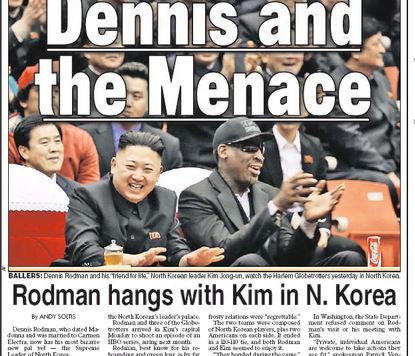 “Dennis and the Menace” is the New York Post’s headline for a photo of former NBA star Dennis Rodman sitting courtside with North Korean leader Kim Jong-un. Rodman is in North Korea to shoot an episode of an HBO series, which is airing next month. He told the 29-year-old Kim, “you have a friend for life,” before sitting down to watch some basketball