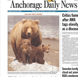 There’s a cute family portrait on the front page of the Anchorage Daily News this morning. That’s a mother brown bear and her three cubs all perched on a piece of driftwood in Alaska’s Katmai National Park and Preserve. According to the paper, the park is one of the best places in the world to see brown bears in their natural habitat.