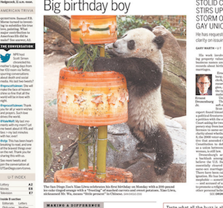 Your cute animal photo of the day comes from the San Diego Union-Tribune this morning. That’s Xiao Liwu celebrating his first birthday at the San Diego Zoo with a 200-pound cake. While most toddlers would probably insist on icing, Liwu’s cake is frosted with carrots and sweet potatoes and made out of ice. He still looks pretty happy with it.