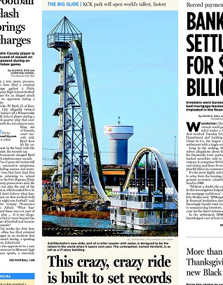 The Kansas City Star offers a look at a new, 17-story water slide being built at the Schlitterbahn water park. It’s called The Verrückt — German for insane — and it will be the tallest and fastest water slide in the world when it opens at the Kansas City, Kansas park next year. After making a 264 step climb, riders will hit an estimated 65 miles per hour on the way down.