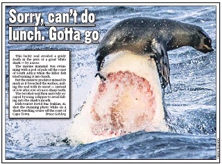 Your photo of the day comes from the New York Post. A tourist captured this shot of a seal narrowly escaping the jaws of a great white shark off the coast of South Africa. After the shark missed on its initial attempt, the seal used its fin to avoid falling into the shark’s mouth.