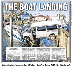 Great photo in the New York Post today. The driver of this van parked more than a little outside the lines at the end of a high-speed chase, one that ended with a high-speed swim. Amazingly, the 20-foot motorboat stayed afloat, even with a van parked on top of it.