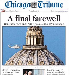 There’s an awesome photo on the front page of the Chicago Tribune this morning of Pope Benedict XVI’s farewell to the Vatican. That’s him in a helicopter getting a lift past St. Peter’s Basilica on his way to the papal summer villa outside Rome.