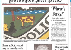 The Burlington Free Press says officials failed to notice a modification to a decal used on state police cruisers until the paper pointed it out yesterday. Apparently, a prisoner-artist added a pig while updating the logo four years ago as part of a work program in the state’s Correctional Industries Print Shop. I’d call that getting the last laugh. Want to see the prank pig? Look at the cow’s spots.