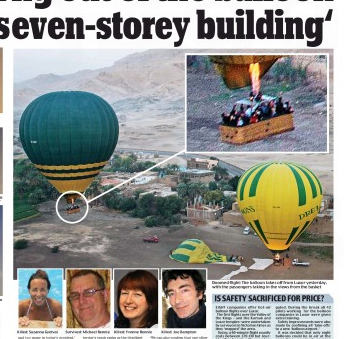 More on the tragic hot air balloon crash in Egypt from the Daily Mail this morning. According to the paper, the pilot and one tourist jumped as soon as there was trouble, which basically doomed everybody else because that made the balloon lighter and it shot up higher. Both men survived the accident which left 18 others dead.