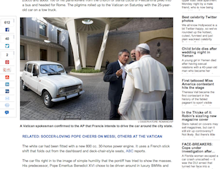 There will be no pope-mobile. The Vatican has confirmed that Pope Francis plans to drive himself around in a used car. The New York Daily News says his security detail is “in a tizzy” about the plan. The car, an 1984 Renault, was a gift from a priest in northern Italy who used it to visit poor parishioners. At first, Pope Francis was reluctant to accept the gift, sources say, thinking it would be better if it went directly to the poor. But he was finally convinced that taking the car, which has 180,000 miles on it, would be acceptable.