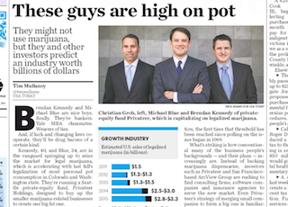 The legalized pot business is, in a word, smoking—which is why investors like Seattle private-equity fund Privateer Holdings are racing to get involved, says USA Today.  Privateer is buying a slew of smaller pot businesses to create “one bigfat one,” betting on the fact that the legalization trend will spread across the country. What’s striking, says the paper, is how traditional the background of many of the new “drug barons” is—they are bankers and Yale MBAs and “wearers of ties.”