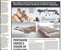 President Obama wants to trim the fat from the Pentagon’s budget. His plan, which was unveiled yesterday, imagines a much smaller military, only capable of “one major conventional war at a time.” The news played big in San Diego, which has a huge military presence. But the Union-Tribune says the city would likely be safe from cuts because “Asia, special operations troops and technology” are major components of the president’s new vision.